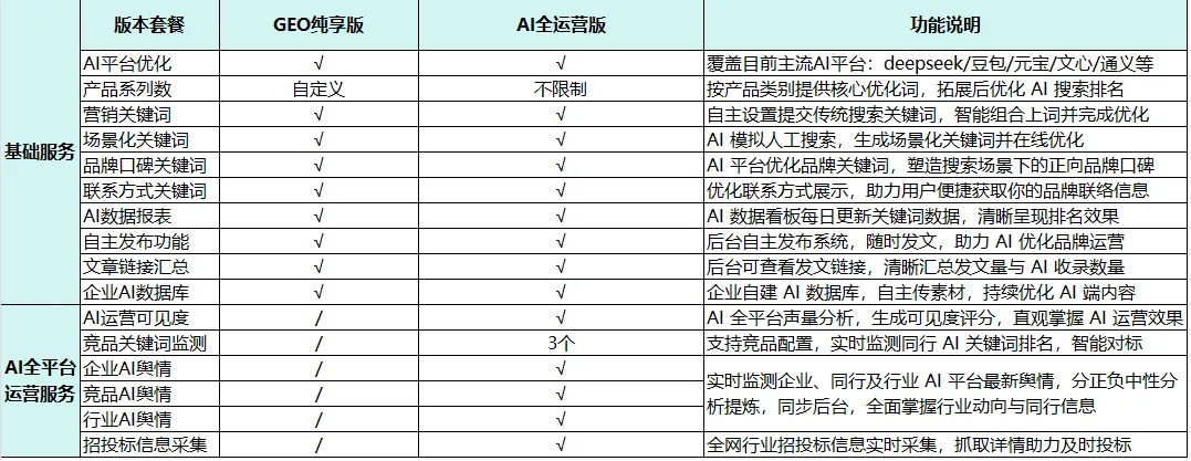 GEO纯享版已为企业解决了AI时代的“入场券”问题,专注于提升企业在各大AI平台(如Deepseek、豆包、文心一言等)“被看见”。