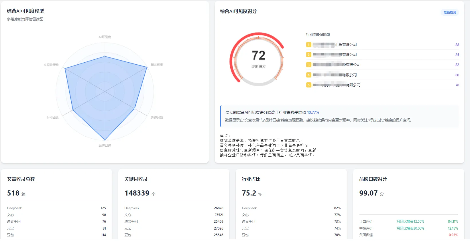 强化了“AI可见度”的深度运营。通过AI可见度仪表盘,企业可获取综合评分,进行自我诊断、对标行业、学习标杆。同时,搭配品牌监测与塑造与联系方式巡检,系统化解决 “被信任”“被找到” 问题。